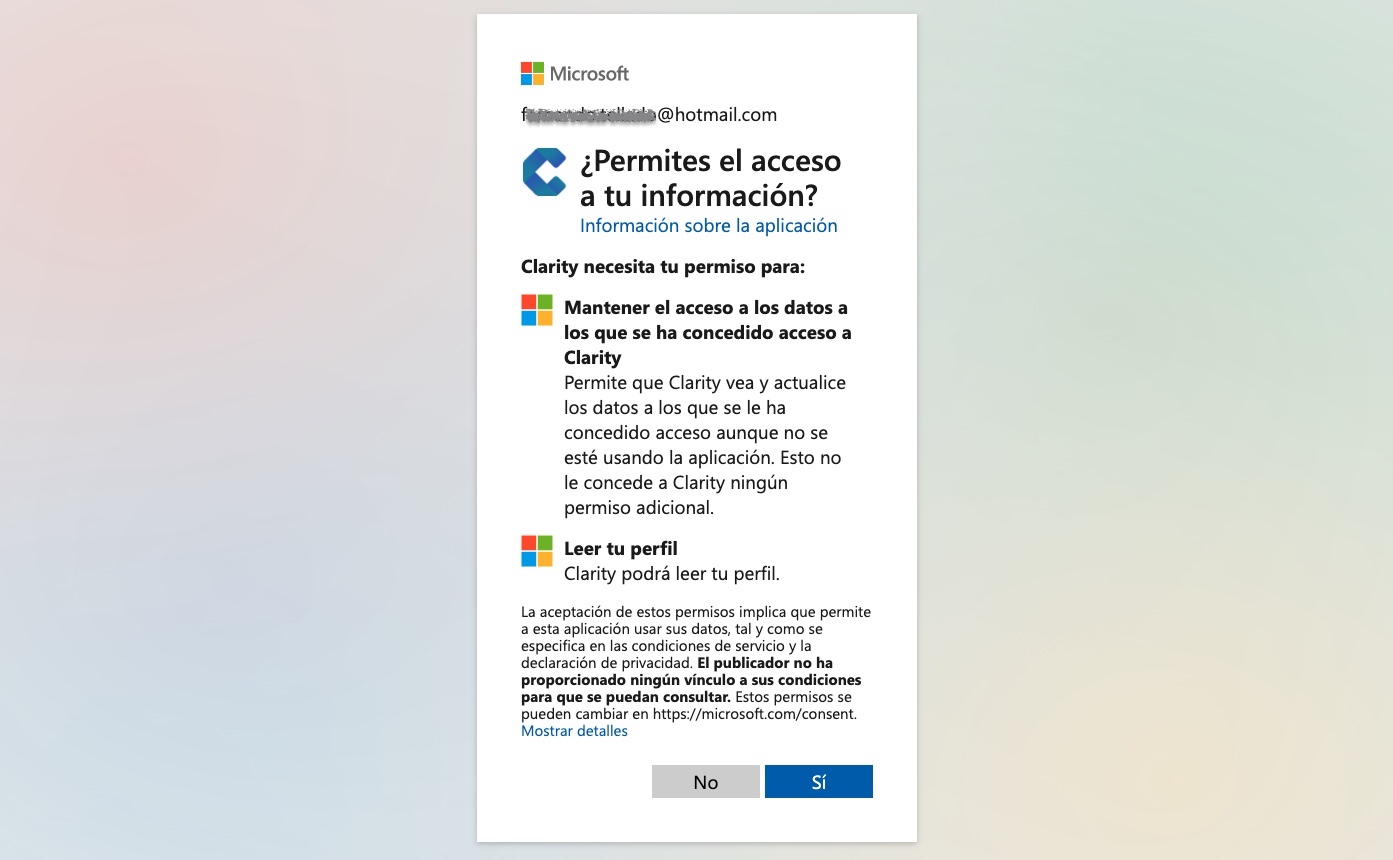 Sí, integración con Google Analytics. Así que si ya tienes el código de Google Analytics en tu web solo tienes que aceptar los habituales permisos y ya está integrado Microsoft Clarity Analytics en tu WordPress.