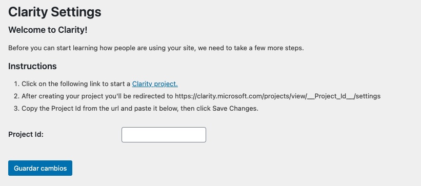 Ya hay un plugin oficial de Microsoft Clarity Analytics, que solo tienes que instalar, activar, y en su página de ajustes apuntar el ID del proyecto asociado a tu web, previamente creado como hemos visto en los pasos anteriores.