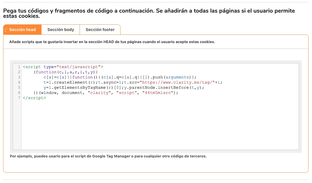 Salvo que hayas conectado tu cuenta de Microsoft Clarity Analytics con Google Analytics, en los otros dos métodos el procedimiento es el mismo: copiar y pegar el código de seguimiento.