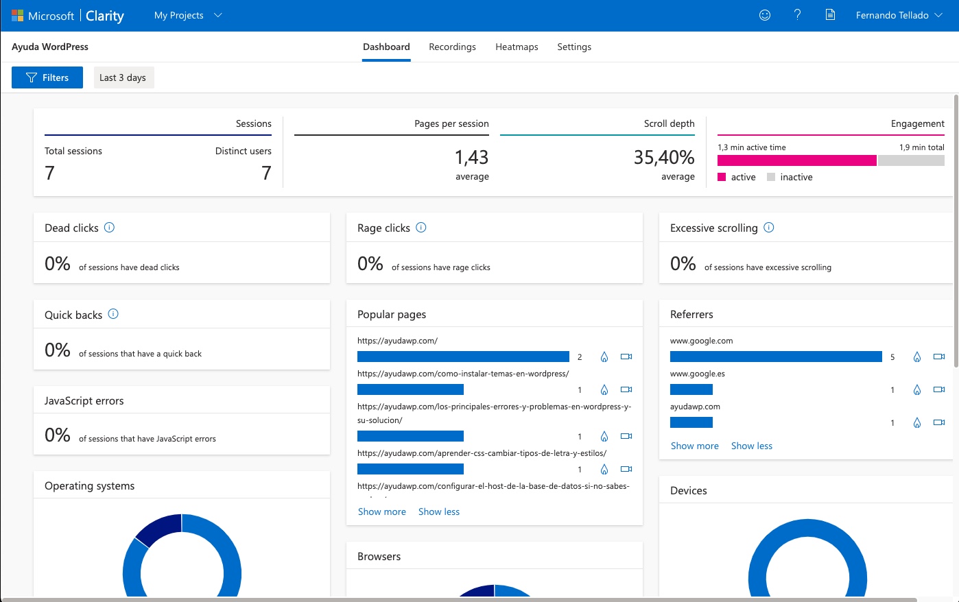 Y ya está, ahora solo te queda esperar a que Microsoft Clarity Analytics recopile datos de tus visitas durante unas horas, o días, para que empiece a mostrarte datos relevantes de cómo tus visitantes utilizan tus páginas.