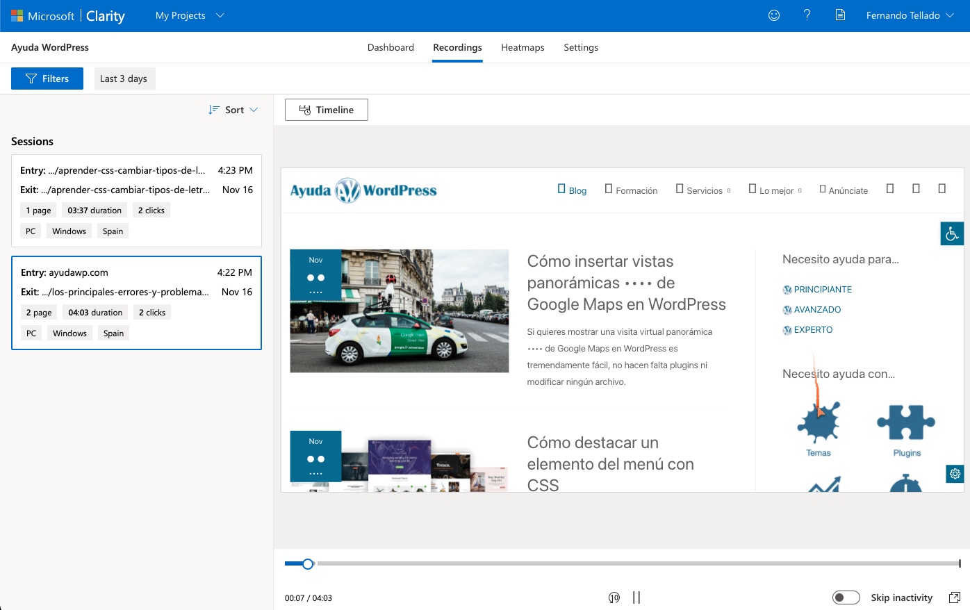 Esta es quizás la parte más golosa, curiosa, porque puedes ver grabaciones de cómo los usuarios navegan por tu web, y seguro que te sorprenderá dónde se paran, en qué hacen clic, dónde se equivocan porque creen que pueden hace clic en algo. Muy interesante, para aprender y tomar medidas, por supuesto.
