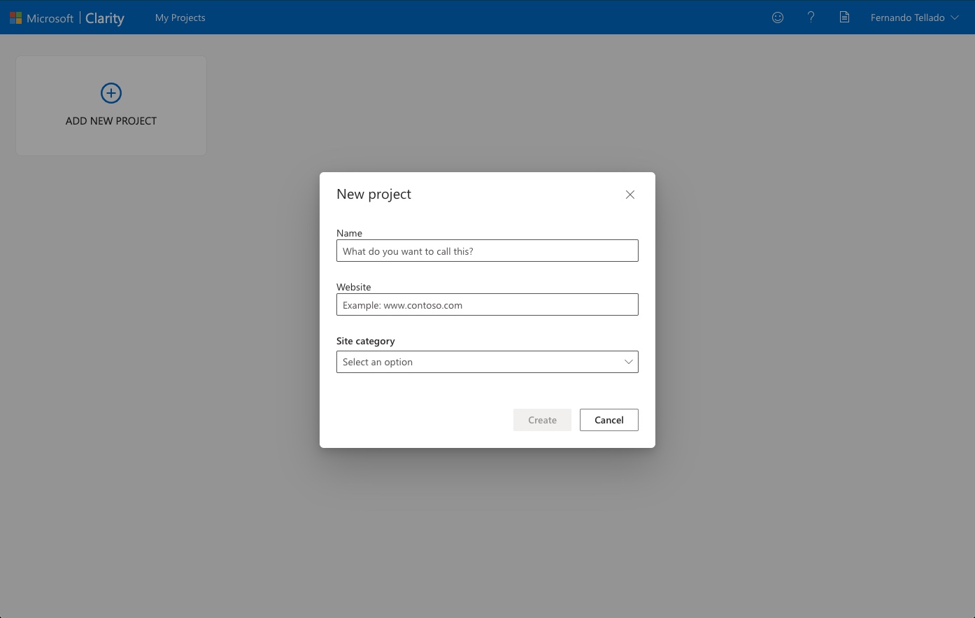 Una vez en la página de Microsoft Clarity Analytics lo primero es crear un proyecto, así que elige un nombre, la URL de la web que quieres analizar y una categoría (blog, ecommerce, etc.)