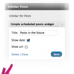 - Simple scheduled posts: ofrece un widget mediante el que mostrar una lista de las entradas programadas. Podemos elegir el título del widget, si queremos mostrar la fecha e incluso un enlace al post futuro (esto último algo inútil para usuarios sin permisos).