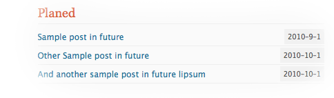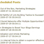 [scheduled-posts], lo publicas y lo enlazas donde quieras para que esté visible, en esa entrada o página se verá una lista de las entradas programadas. Una peculiaridad interesante es que te permite definir un nombre temporal para la entrada, que no tiene porque ser el definitivo ¿por qué?, te preguntarás, pues para que no te roben ideas de futuras publicaciones, sobre todo si tu web es de una temática muy competitiva. De este modo podrías titular algo temporalmente como «Accedemos a una demo exclusiva de la aplicación que estás esperando», y cuando se publique su nombre real podría ser algo como «Prueba exclusiva de Adobe Photoshop CS8», por decir algo. ¿A que ahora tiene más sentido?.