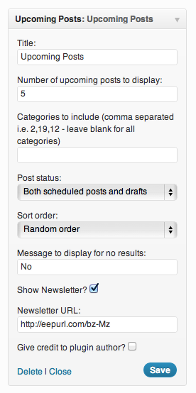 - SOUP: sencillo plugin que nos ofrece un widget, muy configurable, para mostrar las entrada programadas. Entre los ajustes que podemos seleccionar tenemos: título del widget, número de entradas, de qué categorías, si queremos que se muestren los programados, los borradores o ambos, mensaje a mostrar cuando no haya nada programado, enlace a la suscripción o newsletter, y si queremos poner ese enlace. Muy, muy completo.