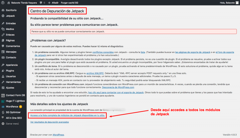 Exactamente, desde ese enlace de DEBUG accedes al llamado centro de depuración de Jetpack, en el que, además de información de depuración, abajo tienes el ansiado enlace a todos tus módulos.