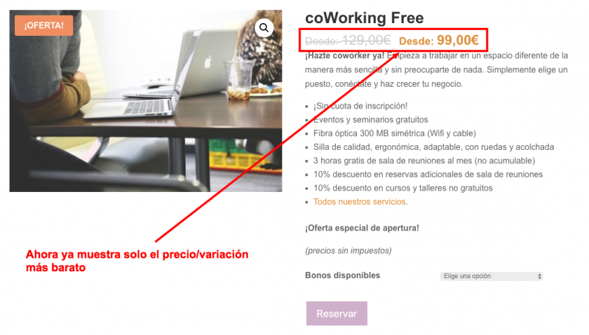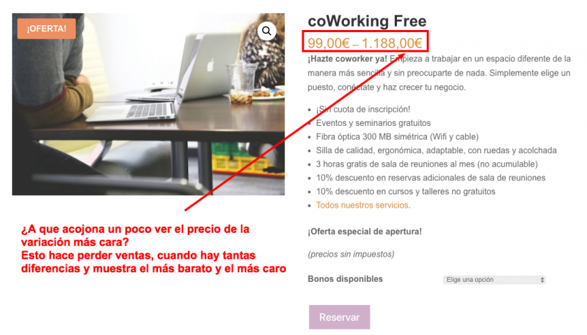 Imagina, por ejemplo, que ofreces un alquiler o reserva, que va de 99€ al mes si se contrata solo un mes a más de 1.500€ contratando un año completo. WooCommerce mostrará el precio más barato, 99€, y el más caro, 1.500€, donde lo que más se ve, lo que asusta, son los 1.500€. Pierdes ventas seguro.