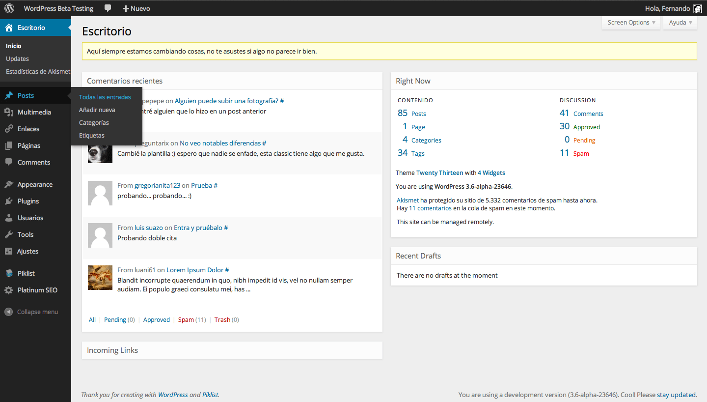Y muchas más cositas que tu mismo puedes descubrir instalándolo y viendo cómo sería el nuevo escritorio de WordPress. O si quieres, puedes probarlo en el sitio de pruebas de WordPress.