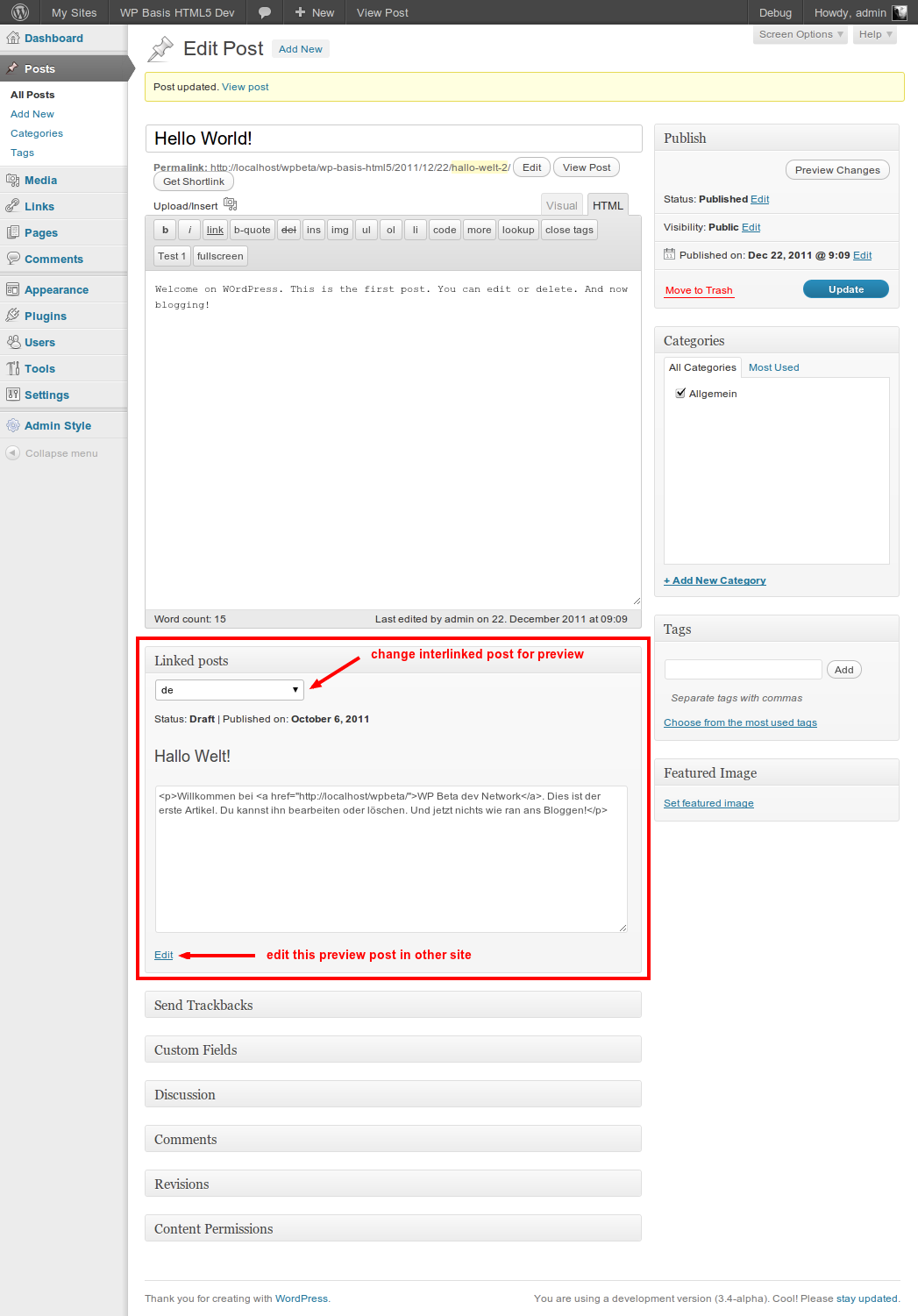Tu escribes un post en un idioma, y se crea el mismo en los otros sitios/idiomas, cada uno enlazado al resto, y solo esperando a que escribas la traducción en cada uno de los idiomas.