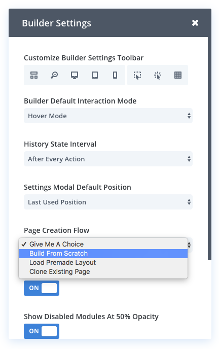 Además si no quieres que aparezca puedes ir a las opciones del constructor visual y hacer que cada vez que creas una nueva página, por defecto vaya directamente a una de esas 3 opciones sin darte a elegir: