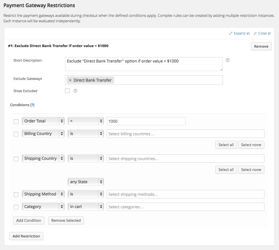 Este plugin de los creadores de WooCommerce ofrece, entre sus múltiples configuraciones, la posibilidad de elegir qué pasarelas de pago se mostrarán por producto, categoría, país o método de envío. Muy completo, eso sí, totalmente configurable como puedes ver en la siguiente captura.