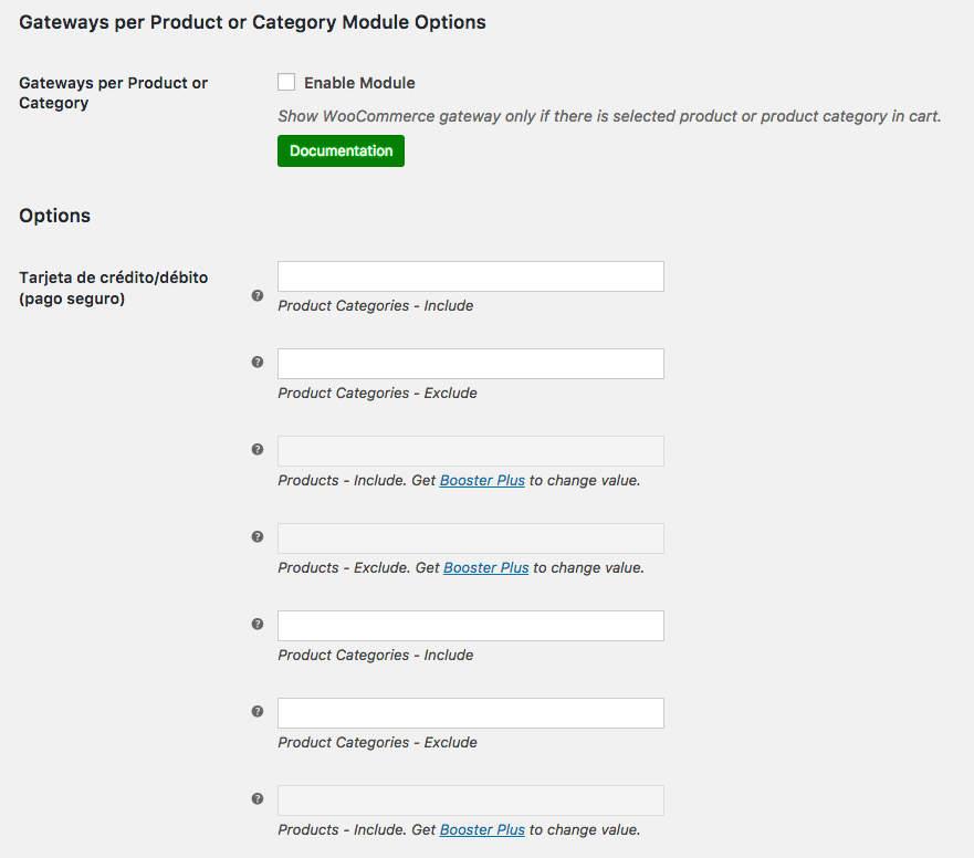 Para este uso es bastante más completo que el anterior al ser su enfoque justo el contrario, y el correcto. Pero, como ves, las opciones para ocultar pasarelas por producto están inhabilitadas, solo disponibles en la versión plus.