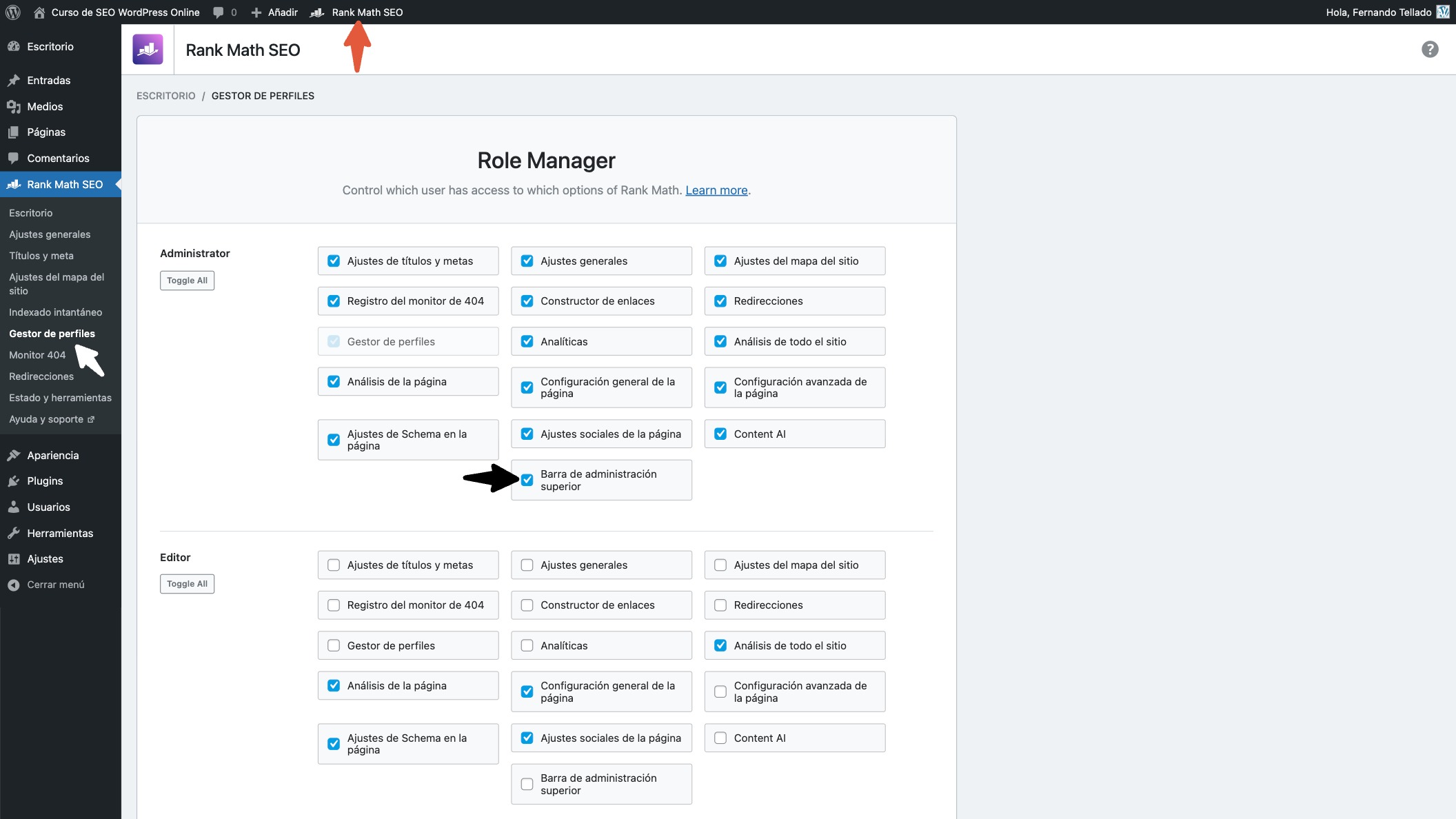 Los perfiles a los que desactives la casilla ya no verán ese molesto menú de Rank Math en TU barra de administración de WordPress.