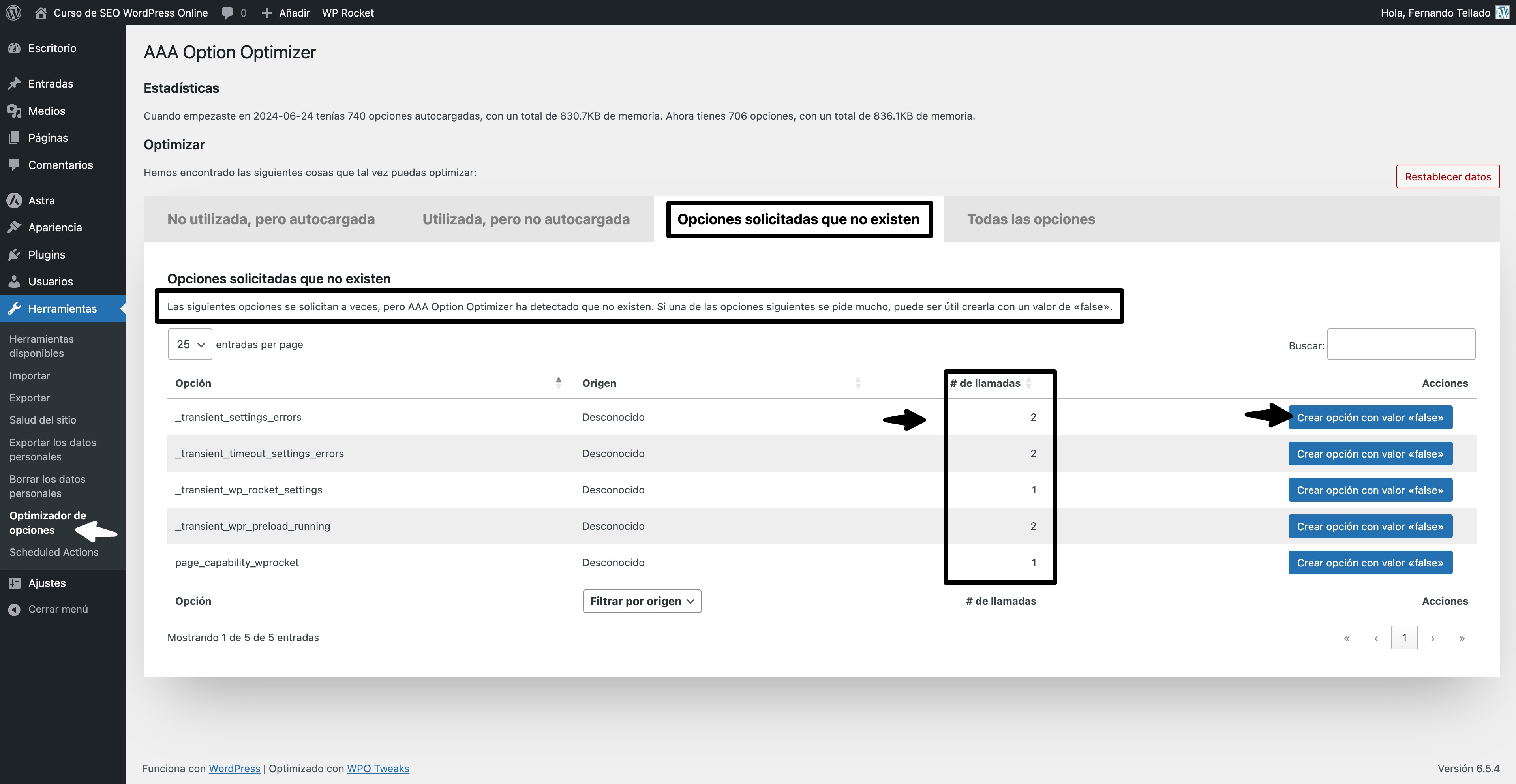 - Opciones solicitadas que no existen – Opciones solicitadas por plugins o el tema en algún momento de la navegación por tu web que resulta que no existen en la tabla de opciones. Muchas veces son simplemente temporales, pero si detectas que se solicitan habitualmente puedes crearlas con el valor