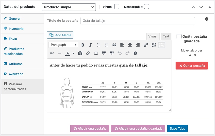 Ahora, imagina que la pestaña anterior querrías usarla en más de un producto, pues para eso tienes con el plugin la opción de crear lo que se llama pestañas de producto personalizadas guardadas.