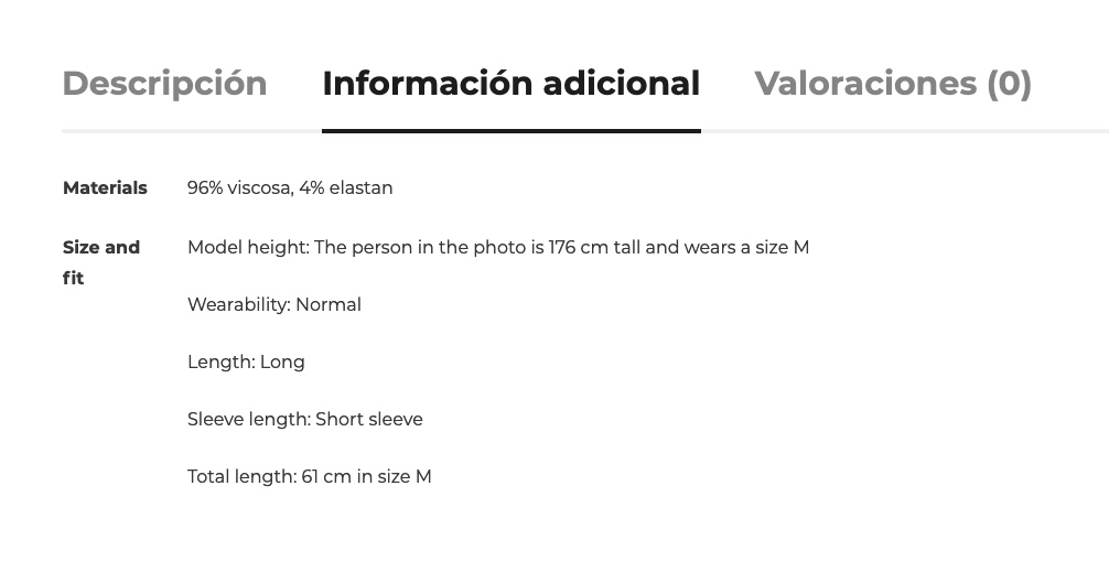 - Información adicional: Donde se muestran los atributos del producto, si existen.