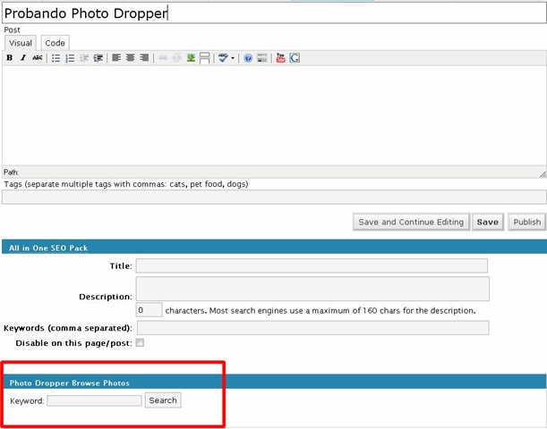 Las imágenes en los posts es una práctica muy recomendada, y para ayudarnos con eso viene Post Photodropper, que no es ni más ni menos que un Plugin que permite a los redactores de Wordpress utilizar un buscador de imágenes de Flickr con licencia CC, lo cual evita cualquier tipo de problema de copyright (mientras el blog no sea comercial) evitando tener abierta otras pestañas de nuestro navegador buscando imágenes de un lado para otro, eso es historia.