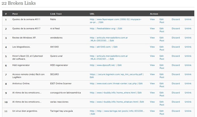 Broken link checker es un plugin que, luego de descargarlo e instalarlo, busca en todo nuestro blog todos los links de nuestros posts y en caso de que no estén mas activos aparte de avisarnos y decirnos el post donde se encuentra el link muerto y darnos la posibilidad de editarlo (desde opciones broken links), los muestra, pero tachados.