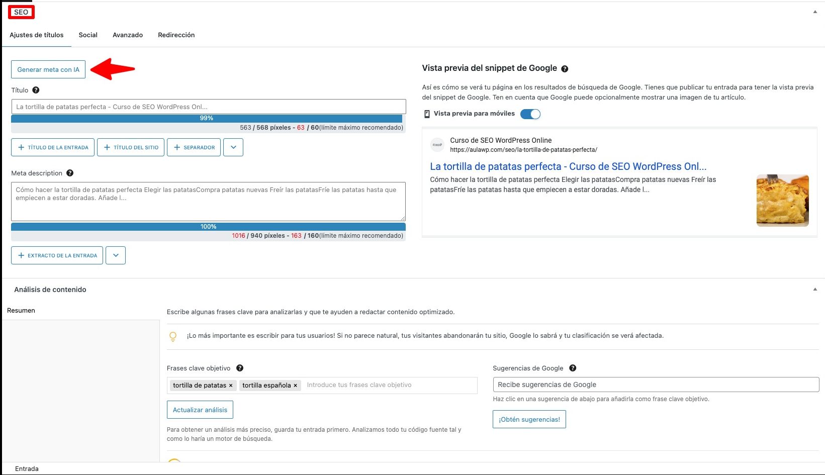 Solo tienes que hacer clic en el botón de «Generar meta con IA» en la caja SEO y se rellenarán automáticamente los campos Title y Meta description, con mejor o peor suerte.