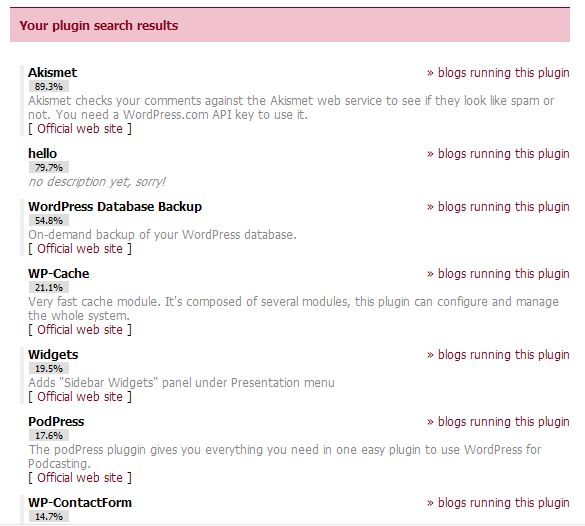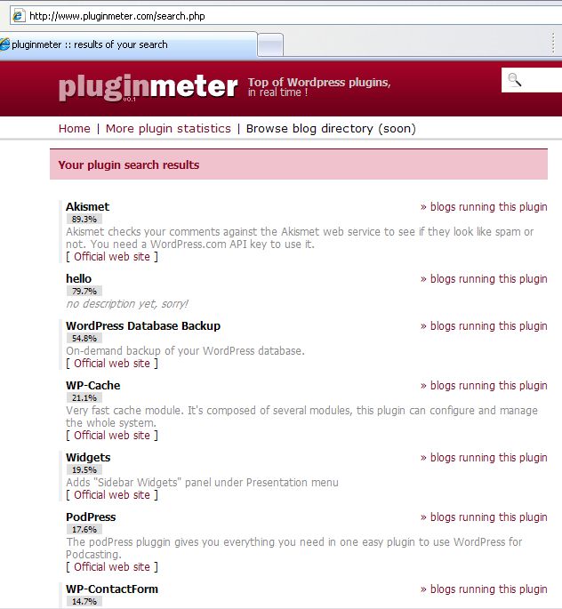 Creo que usted no comprendió cómo funcionaba PluginMeter 😉 Para ver a plugins utilizados por blog, había que ir sobre su página. Por ejemplo: