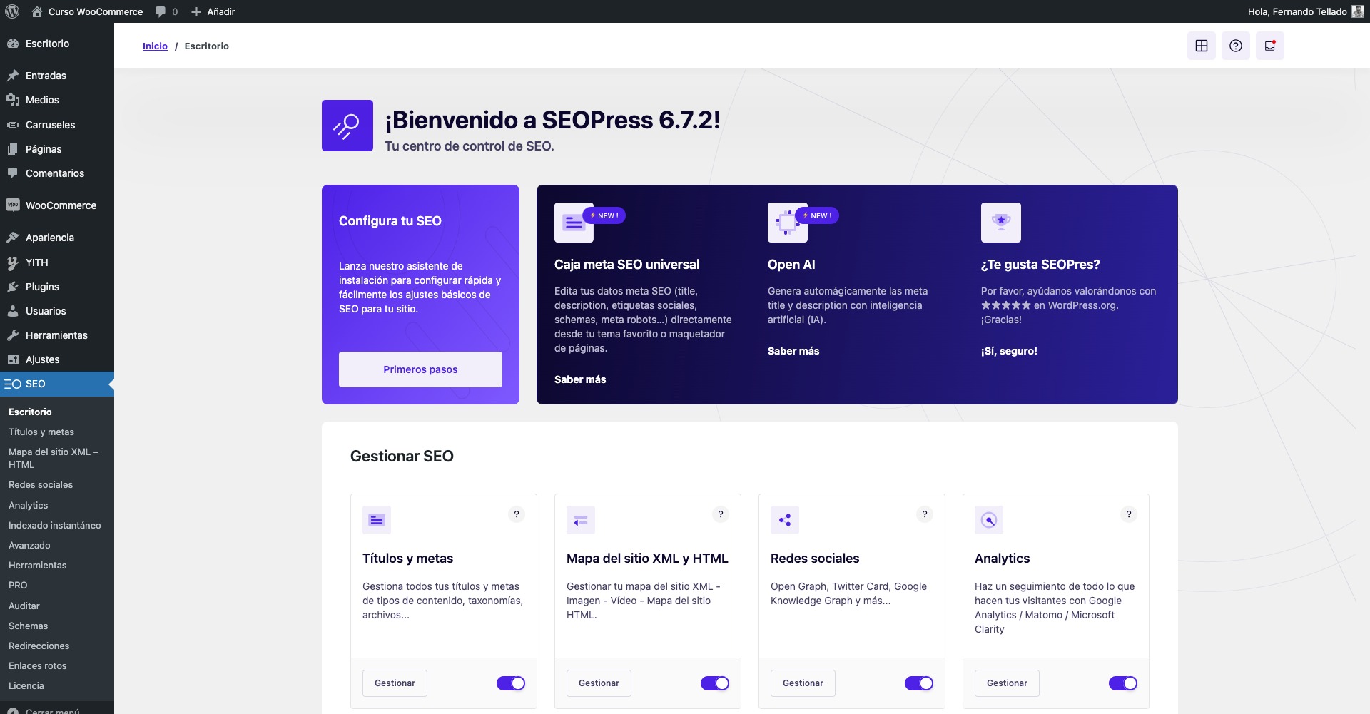 Si tengo que elegir un plugin de SEO general, con el que gestionar todos los elementos principales de posicionamiento de una web, y en concreto de tiendas online, mi elección ahora mismo es SEOPress en su versión Pro, pues por solo 45 € al año tienes el plugin SEO para WordPress más completo, para instalaciones ilimitadas.