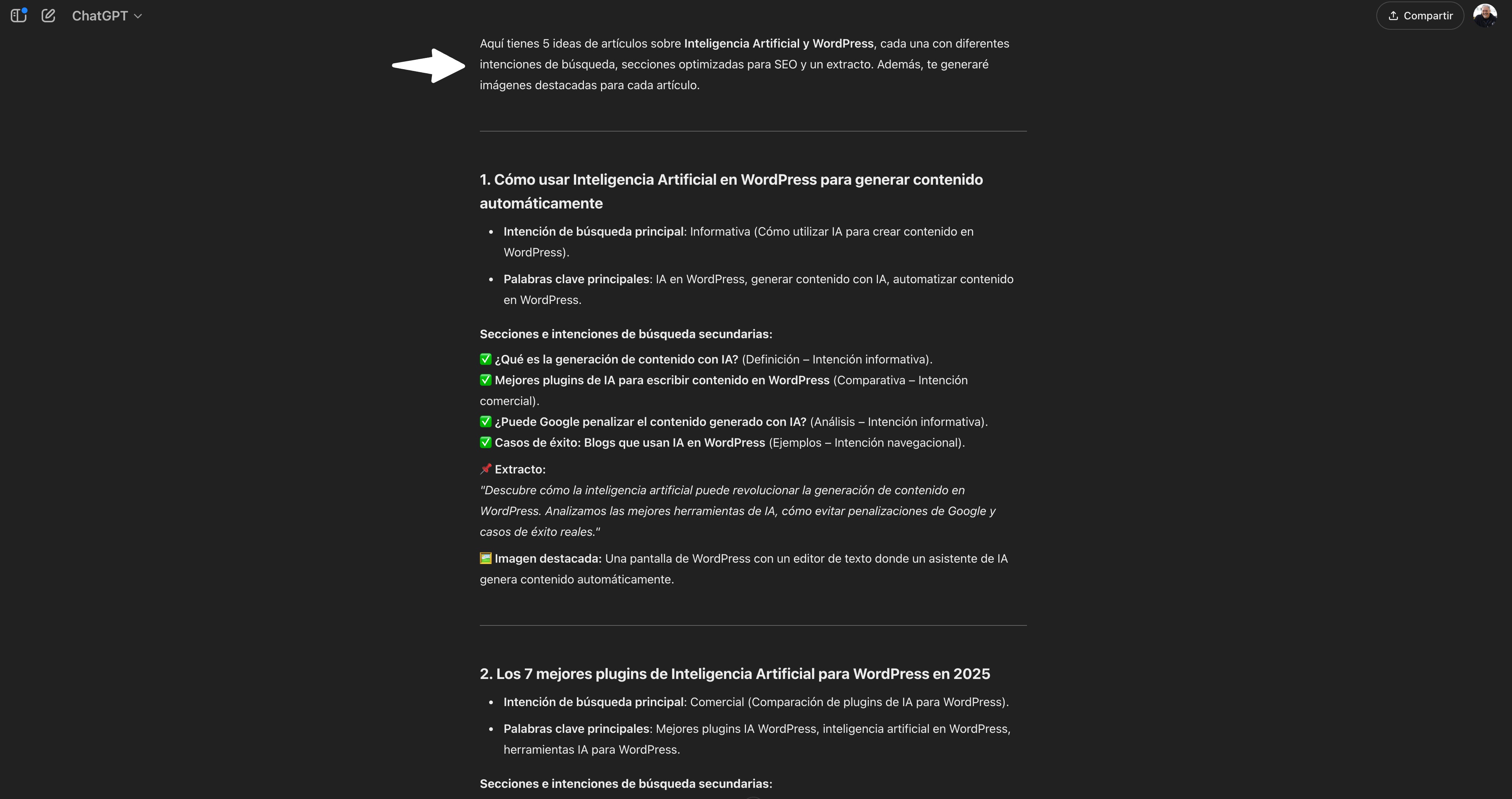- Cada artículo debe responder a una intención de búsqueda diferente, pero todas relacionadas con inteligencia artificial + wordpress