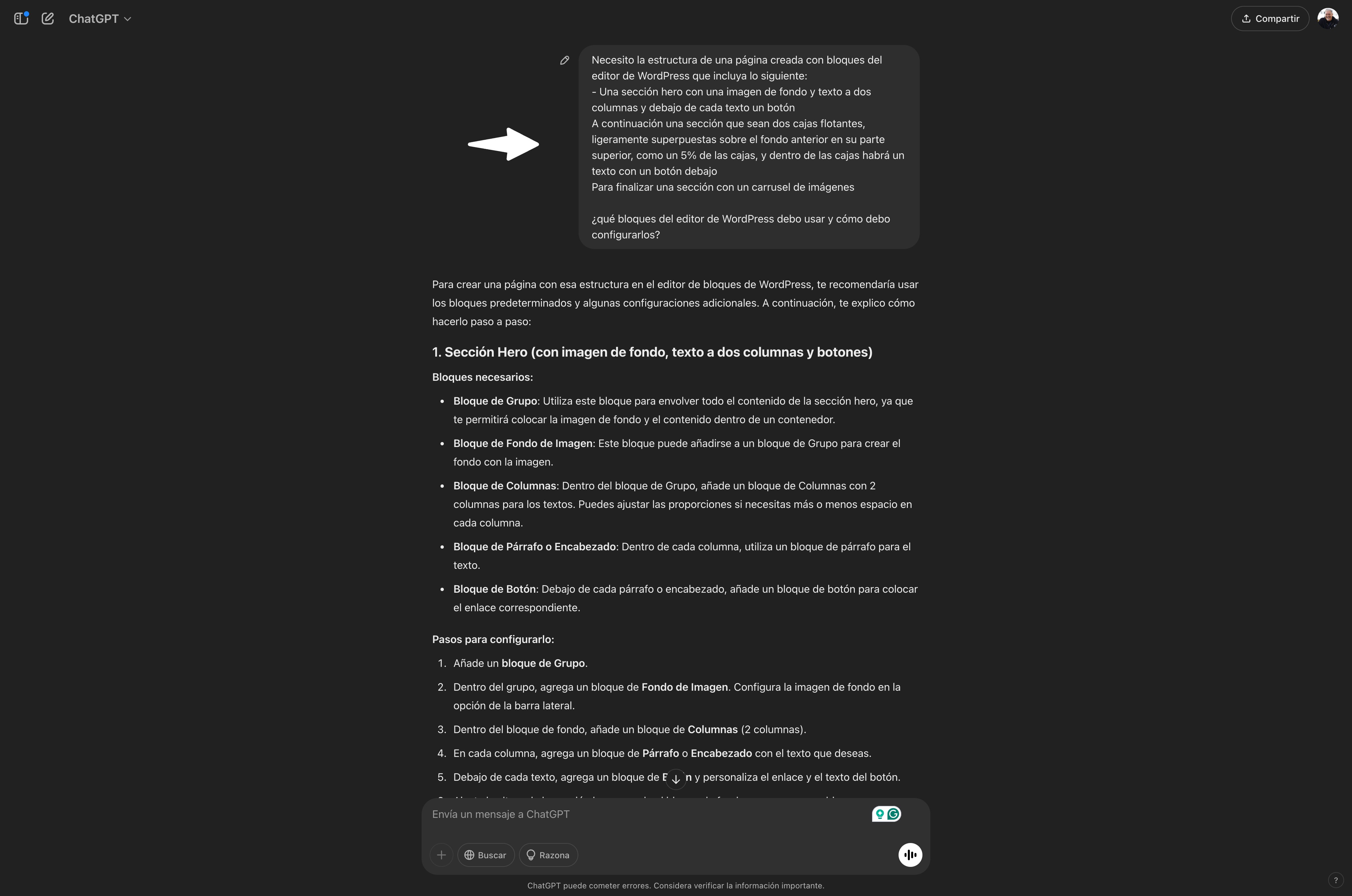 Si le pillas el punto, las IAs pueden incluso sugerirte qué bloques de WordPress usar, y cómo configurarlos, para crear páginas con estilo, solo tienes que ser muy específico al respecto, e ir afinando poco a poco el resultado mediante la conversación con el chatbot.