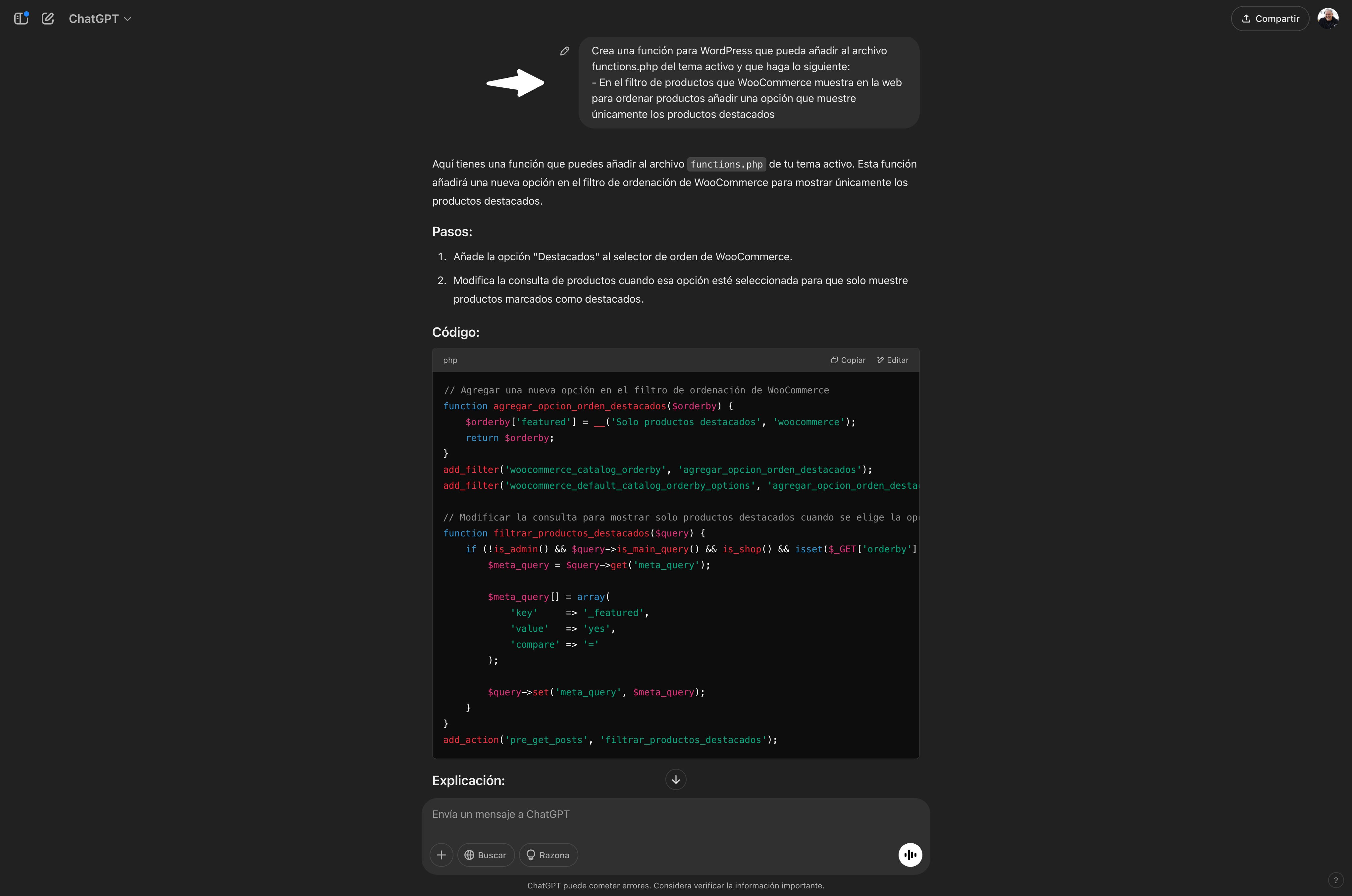 Así que, si tienes clara la necesidad, puedes pedirle a los chatbots que creen fragmentos de código que, añadidos al archivo functions.php u otro método, te ayuden a personalizar «cosas».