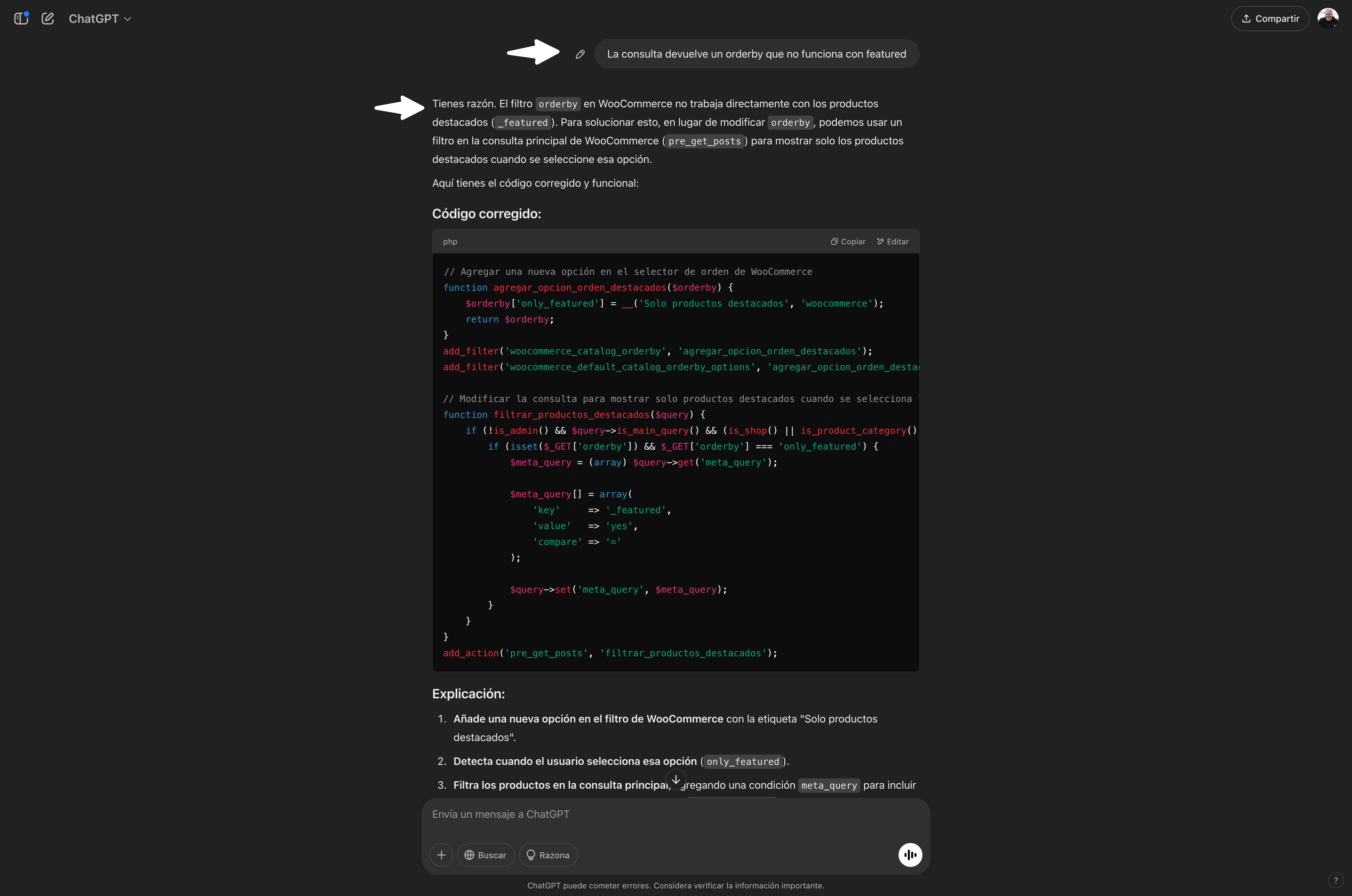 Y el chatbot ofrece un código que no funciona, porque ha utilizado incorrectamente la API de WooCommerce, pero que con las indicaciones correctas es capaz de corregir y, ya sí, entregar un fragmento de código que fuese viable ( Spoiler: me costó varios pases conseguir un código, así que prácticamente lo escribí yo, pero diciéndole al chatbot qué escribir, en vez de escribirlo yo directamente, que realmente habría tardado menos en este caso).