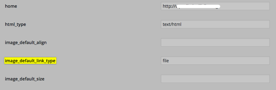Para el caso que nos ocupa hoy busca por image_default_link_type y verás una caja de texto donde por defecto aparecerá «file», el ajuste por defecto de WordPress, lo que significa que tus imágenes enlazan por defecto al archivo multimedia, a la imagen completa.