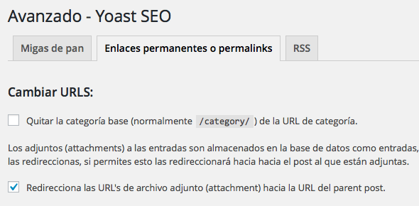 - Yoast SEO: No es lo mismo, es una variación de lo que estamos hablando, pero el plugin de SEO de Yoast tiene una opción en la página de configuraciones Avanzado -> Enlaces permanentes o permalinks en la que puedes especificar que las páginas de adjuntos que crear WordPress las imágenes enlacen a la entrada a la que pertenecen, mucho mejor para el SEO interno.