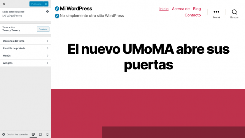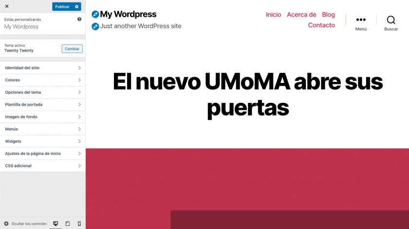 Ahora tendrías las secciones de ajustes del personalizador propias del tema activo, además de las secciones de widgets y menús de WordPress, para cuando quieras personalizar menús y widgets en cualquier momento.