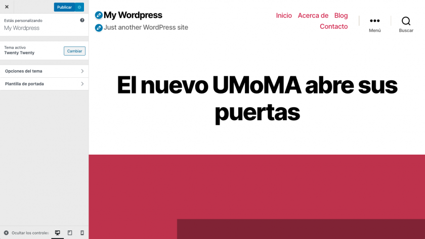 Como puedes comprobar, se han eliminado todas las secciones estándar de WordPress del personalizador, quedando solamente las que pertenecen al tema activo.