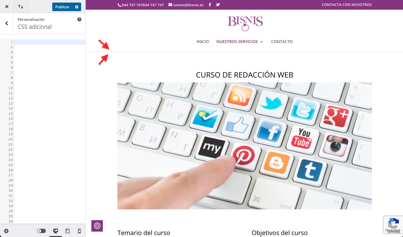 Para añadir el código abre la sección de administración Apariencia → Personalizar → CSS adicional, pega el código y publica los cambios.