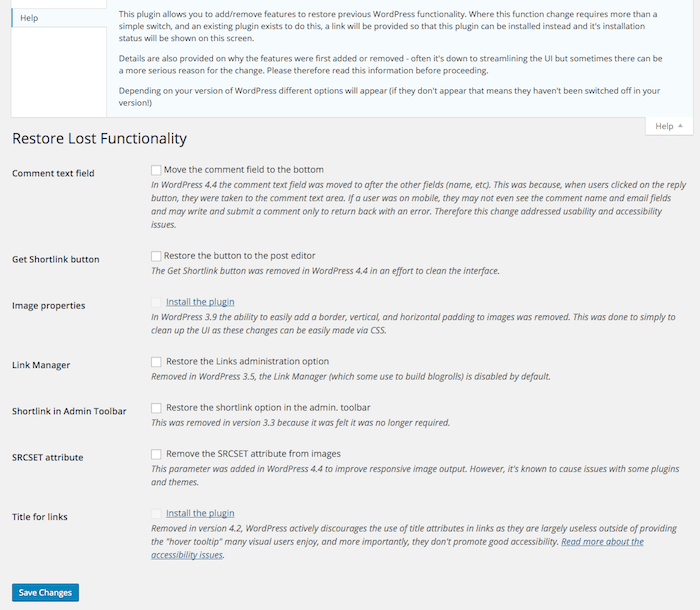 Pues bien, puedes recuperarlas, todas o a voluntad. Solo tienes que instalar el plugin Restore Lost Functionality y, una vez activo, en su página de ajustes podrás activar o desactivar aquellas funcionalidades perdidas de WordPress que quieras, o no quieras.