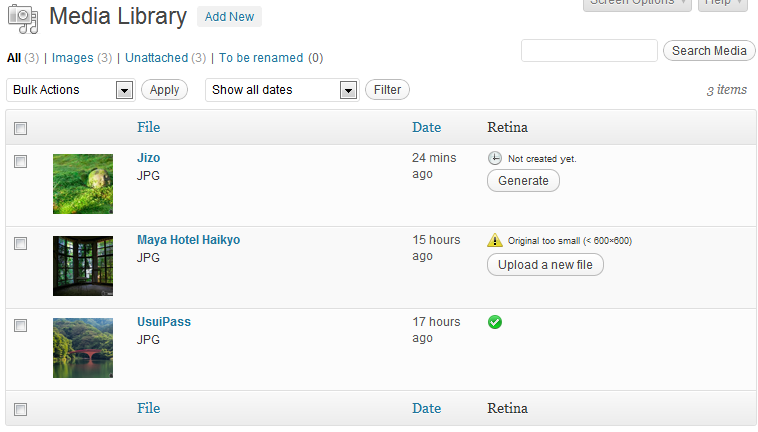 El plugin, una vez activo, crea los archivos de imagen necesarios para dispositivos con pantalla Retina. Si la resolución de las imágenes originales no fuera lo suficientemente alta te muestra un aviso en la Librería Multimedia para que subas imágenes a mayor resolución.