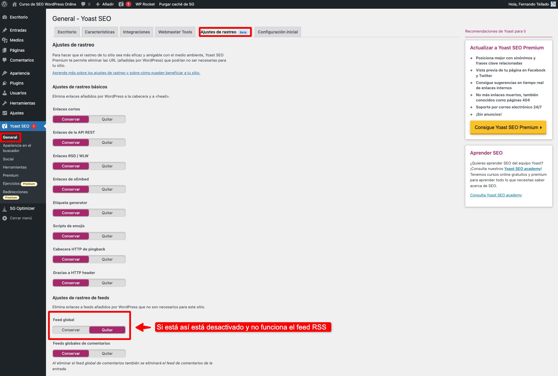 También puede ser, simplemente, que hayas deshabilitado el feed RSS, algo que ofrecen algunos plugins de seguridad, como SG Security, o incluso el plugin de SEO Yoast en su versión Premium.
