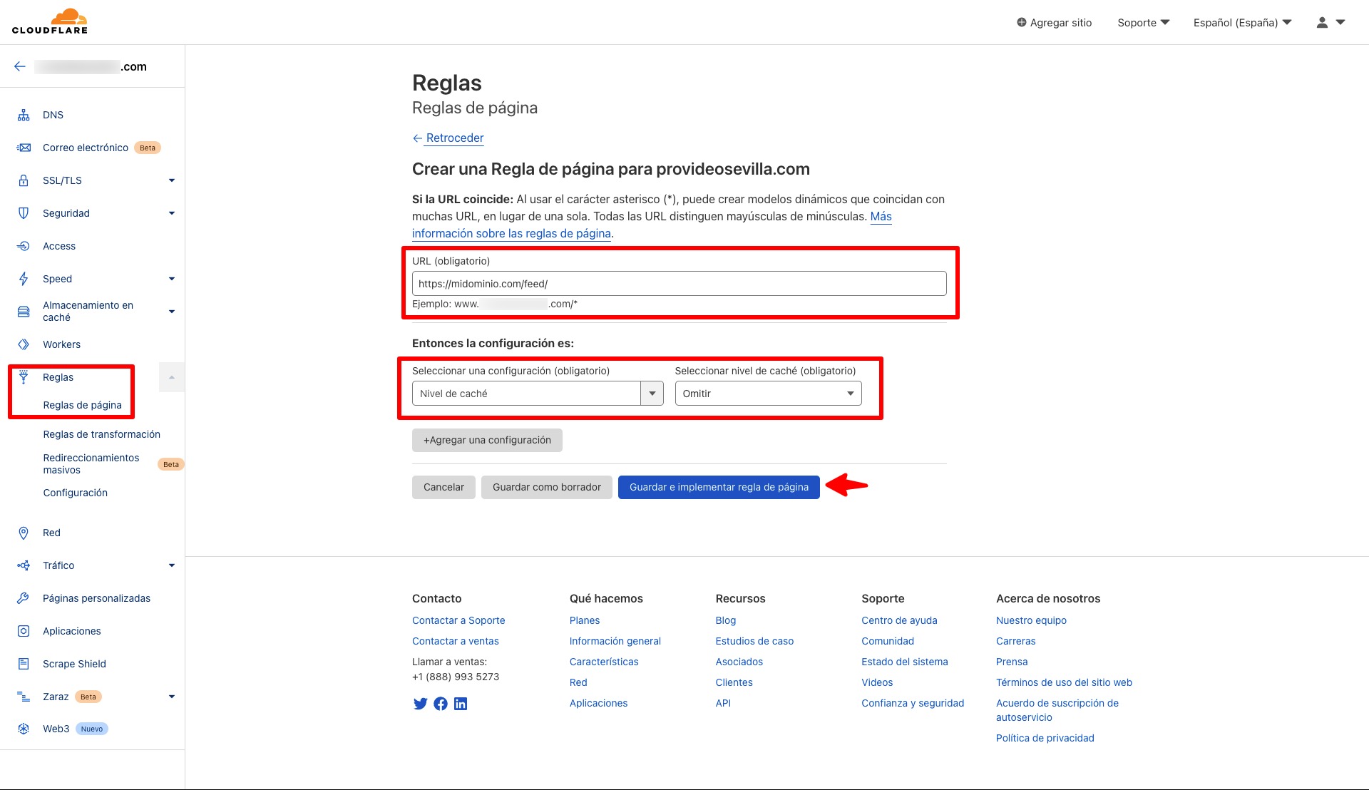 Y no olvides CloudFlare si sirves contenidos desde esta CDN… pues puedes excluir URLs de la caché de CloudFlare mediante reglas de página, como en la siguiente captura…