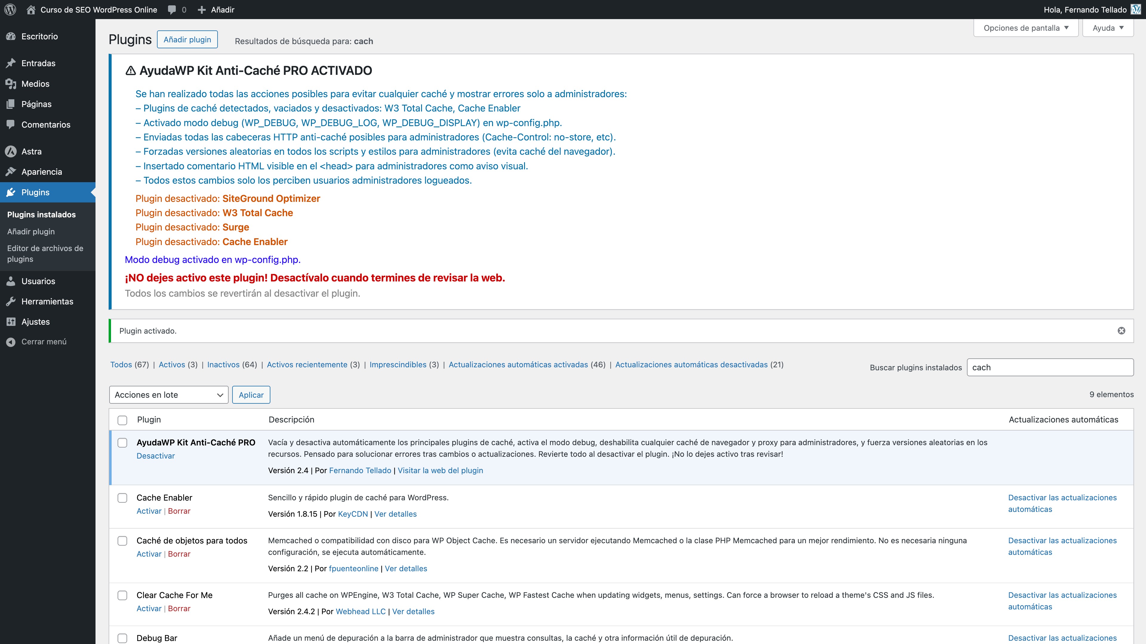 - Desactiva temporalmente plugins de caché durante el desarrollo (el usuario puede reactivarlos fácilmente)