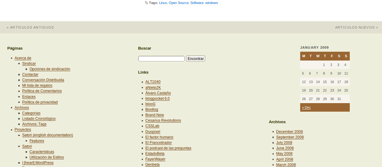 Satorii es un tema para WordPress 2.7 o superior, de estilo minimalista, sencillo y elegante, con un fuerte foco en los contenidos y la facilidad de lectura, con una columna de contenido y tres columnas en el pie de página.