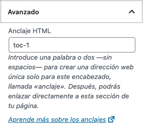 Selecciona cada bloque de encabezado y, a la derecha, en los ajustes del bloque, despliega la sección «Avanzado» y ahí verás una caja en la que poner un anclaje HTML a cada encabezado.