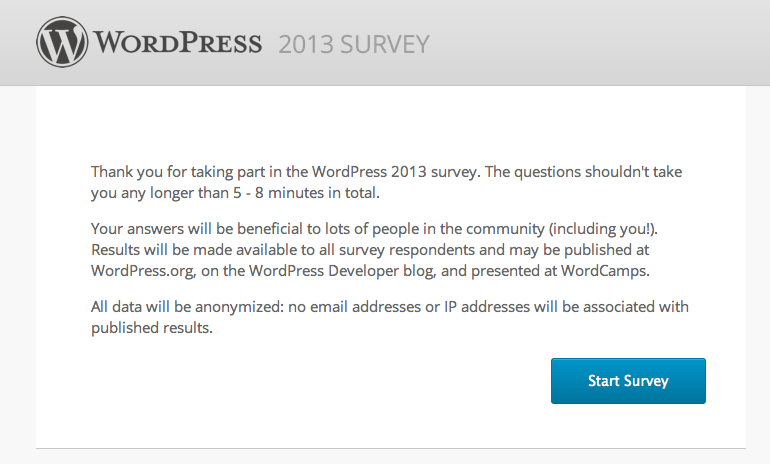 Ya está disponible la encuesta WordPress 2013, en la que se pide información (anónima) sobre el uso que damos a WordPress. Son bastantes preguntas pero es importante completarla pues la información que ahí se recopila