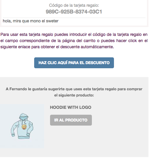 Esto es genial, pues en el email que llegue a quien recibe el regalo le mostrará un botón bien clarito que, al hacer clic, le lleva a la tienda añadiendo automáticamente el importe como descuento, para que compre lo que quiera y que, al pagar, ya tenga el regalo/descuento aplicado.