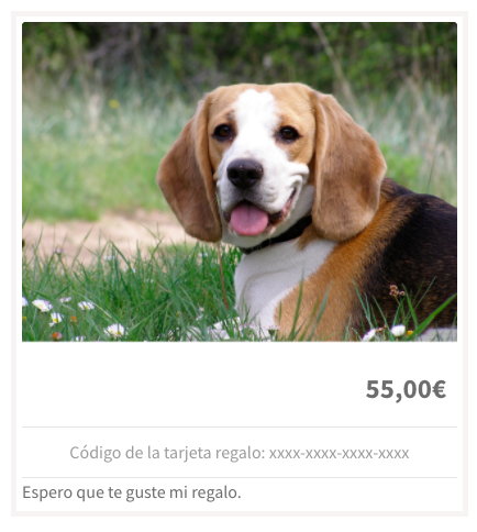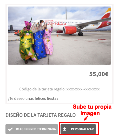 Igual, actívalo siempre para que tu cliente pueda sustituir la imagen por defecto de la tarjeta regalo por una que él haya creado, una foto suya, de tu perro, de toda la familia mandándole un beso o de los Reyes Magos, lo que prefiera.