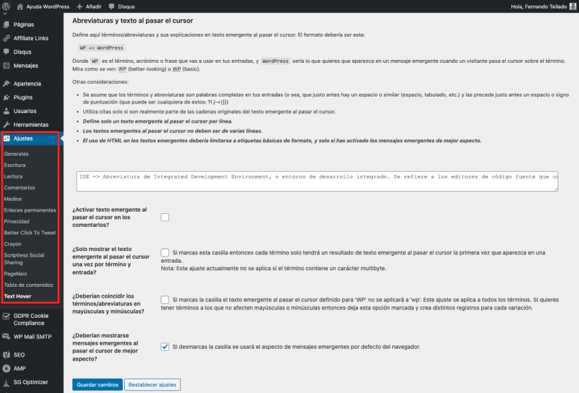 A partir de este momento solo te queda la tarea de ir alimentando de términos, acrónimos, abreviaturas, etc., con sus textos emergentes, los ajustes del plugin.