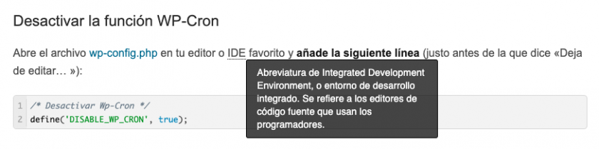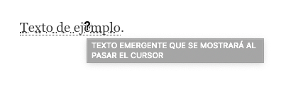 Un recurso muy práctico en sitios técnicos o que suelen usar abreviaturas o acrónimos de términos no muy comunes es mostrar un texto emergente al pasar el cursor por la palabra o abreviatura en cuestión, para dar contexto al visitante y que no acumule malentendidos en la lectura.