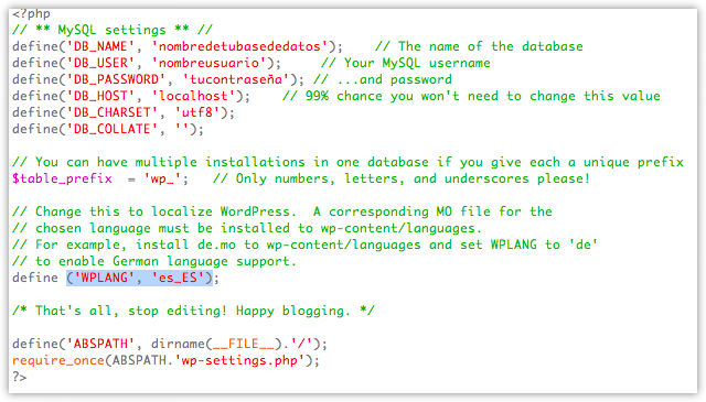 3.- Modificar el fichero wp-config.php para incluir la llamada al fichero de la traducción, que debe quedar así …