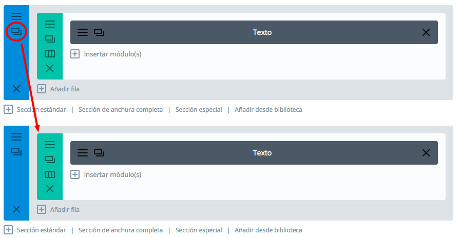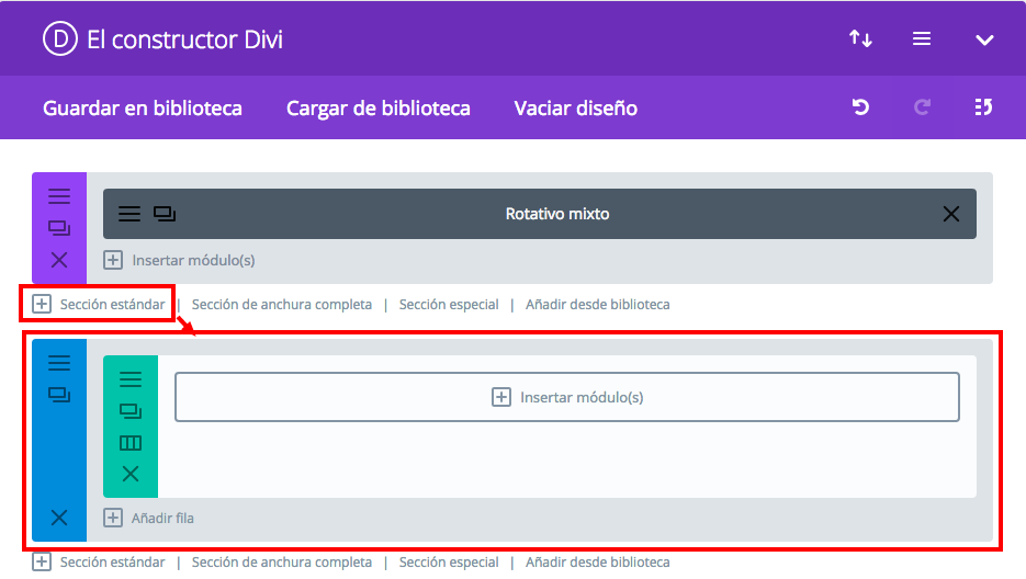 Simplemente pulsa en el enlace para crear una sección estándar y eliges la fila de ancho completo.