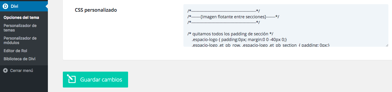 Ya solo nos queda crear las clases CSS que anteriormente hemos nombrado, para ello ve a la administración de WordPress y en Divi -> Opciones del tema -> CSS Personalizado, añade lo siguiente: