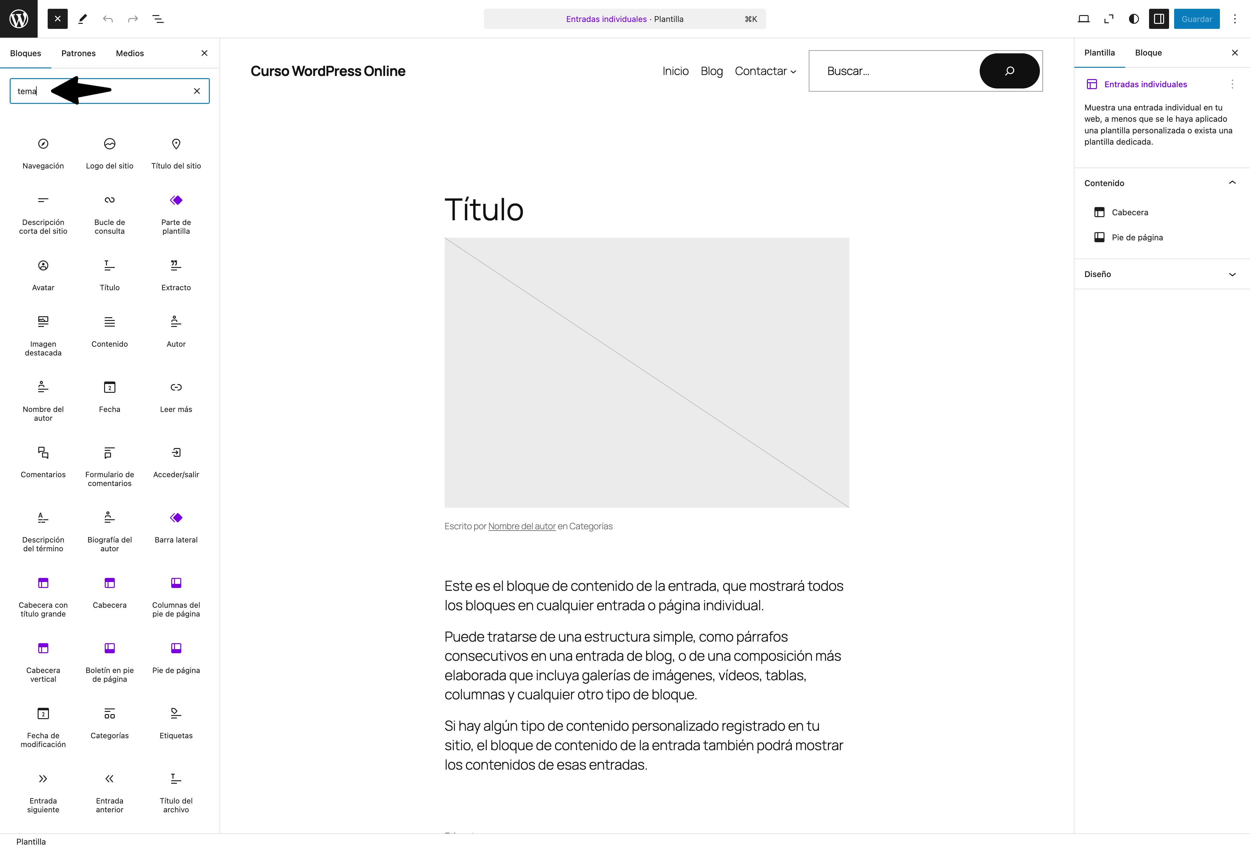 - El editor del sitio dispone de bloques específicos para la edición completa del sitio.